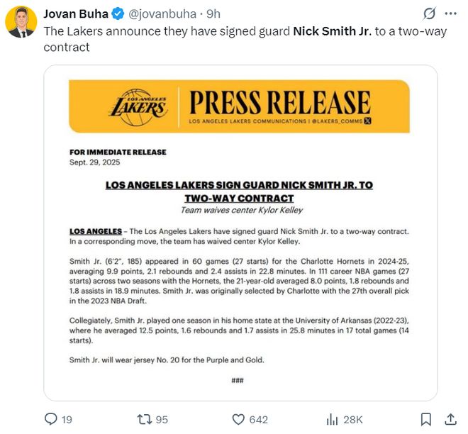 北京时间9月30日,根据湖人队记约什-布哈的报道,湖人队已经用双向合同签下了小尼克-史密斯,史密斯上赛季场均9.9分2.1篮板2.4助攻,湖人签下他之后训练营也完成了21人大名单。两天